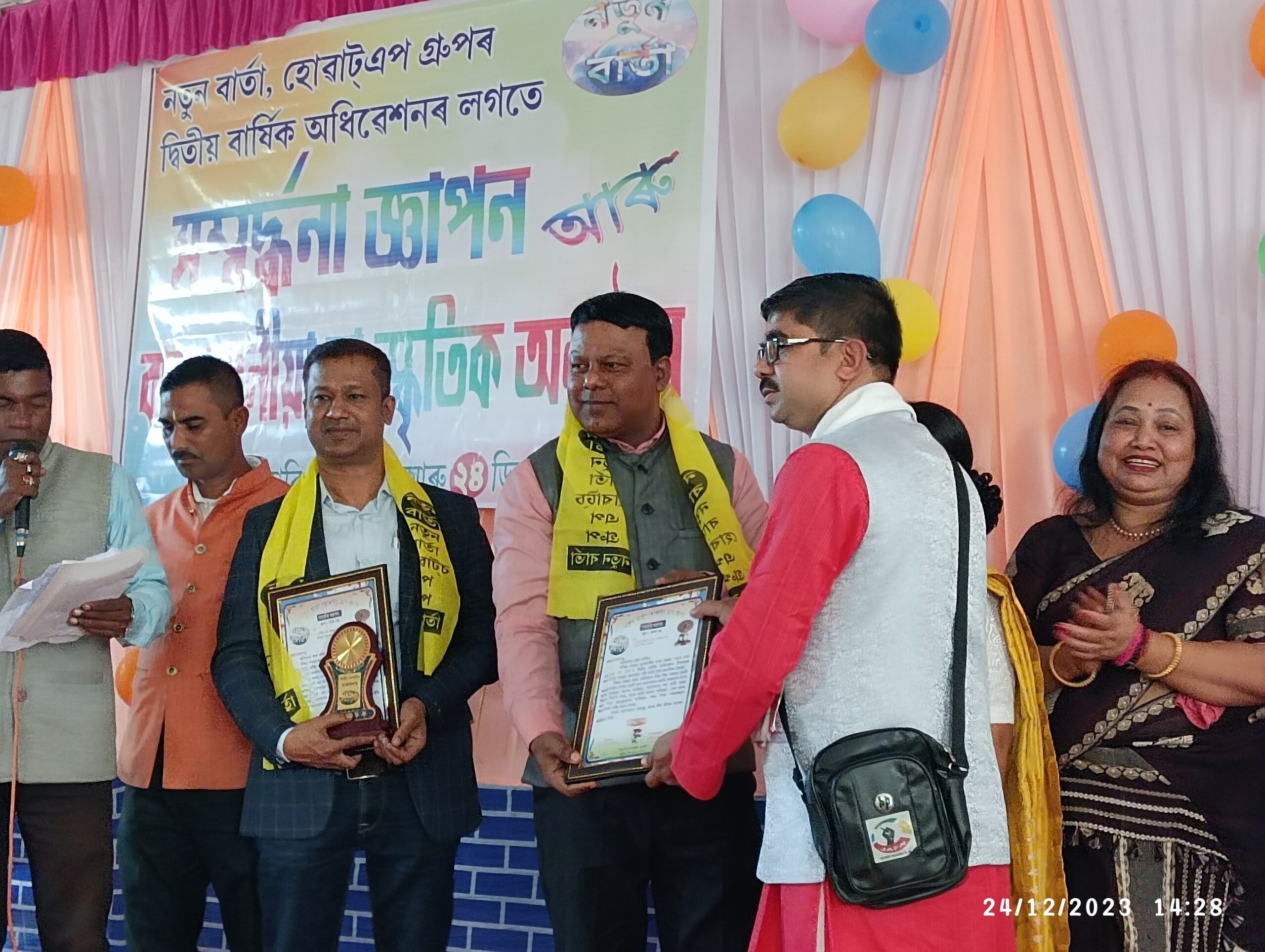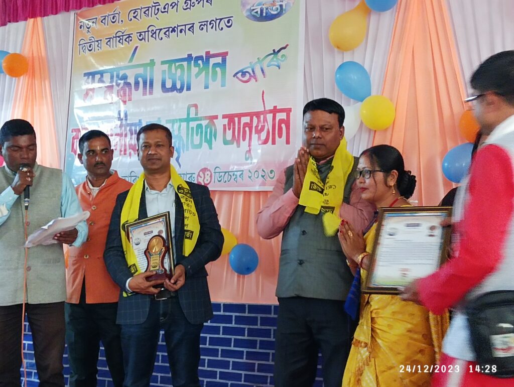 দৰঙৰ ঐতিহ্যমণ্ডিত খটৰা সত্ৰৰ সভাগৃহত বাৰ্তা বাহক নতুন বাৰ্তা হোৱাট্ছ এপ গ্ৰুপৰ দ্বিতীয় বাৰ্ষিক অধিৱেশন আৰু বাৰেৰহণীয়া কাৰ্যসূচী সমাপন ৷ সমাজৰ বাবে সেৱা আগবঢ়োৱা ২০ গৰাকী সাংবাদিক ক্ৰমে জয়দেৱ ডেকা, লক্ষ্যধৰ শইকীয়া, দ্বীপেন ডেকা, কনআলি হাজৰিকাকে ধৰি চিকিৎসক, ডা° জয়ন্ত ডেকা আৰু কেইবাগৰাকী গাঁওপ্ৰধান , শিক্ষক , সমাজসেৱকসহ ৭১ গৰাকী ব্যক্তিক জনোৱা হয় সম্বৰ্ধনা ৷
