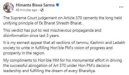 লগতে সামাজিক মাধ্যমযোগে মুখ্যমন্ত্ৰী হিমন্ত বিশ্ব শৰ্মাইও এই সন্দৰ্ভত প্ৰতিক্ৰিয়া প্ৰকাশ কৰে।