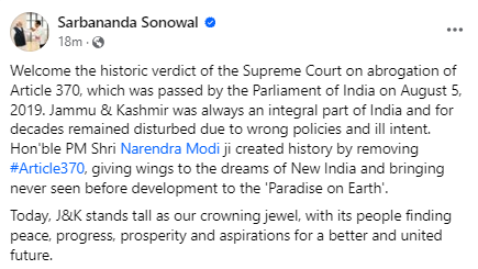 সামাজিক মাধ্যমযোগে অনুচ্ছেদ ৩৭০ প্ৰত্যাহাৰৰ ওপৰত উচ্চতম ন্যায়ালয়ৰ ঐতিহাসিক ৰায়ক স্বাগতম জনাইছোঁ বুলি মন্তব্য কেন্দ্ৰীয় মন্ত্ৰী সৰ্বানন্দ সোণোৱালৰ।