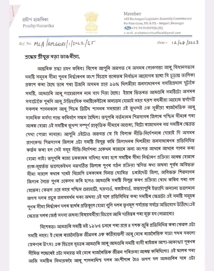 সমষ্টিৰ পুনৰ নিৰ্দ্ধাৰণৰ তালিকা প্ৰকাশ পোৱাৰ পিছতেই অগপ দলত সৃষ্টি হৈছে ধুমুহাৰ। আমগুৰি সমষ্টি বিলুপ্ত হোৱাৰ পিছত ক্ষুদ্ধ বিধায়ক প্ৰদীপ হাজৰিকাই দলীয় পদৰ পৰা পদত্যাগ কৰে। ইতিমধ্যে অগপ দলৰ সভাপতি অতুল বৰালৈ বিধায়ক হাজৰিকাই প্ৰেৰণ কৰিছে পদত্যাগ পত্ৰ।
