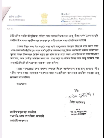 হাজৰিকাই ৰাজ্যিক সাধাৰণ সম্পাদক আৰু কেন্দ্ৰীয় কমিটিৰ সদস্য পদৰ লগতে সকলো সাংগঠনিক দায়িত্বৰ পৰাও অব্যাহতি লয়। উল্লেখ্য যে আমগুৰি সমষ্টি বিলুপ্তি কৰাৰ প্ৰতিবাদত বিৰোধী ৰাজনৈতিক দল সমূহে ১৪ আগষ্টত বন্ধ ঘোষনাৰে প্ৰতিবাদী কাৰ্যসূচী ৰূপায়ন কৰিব।
