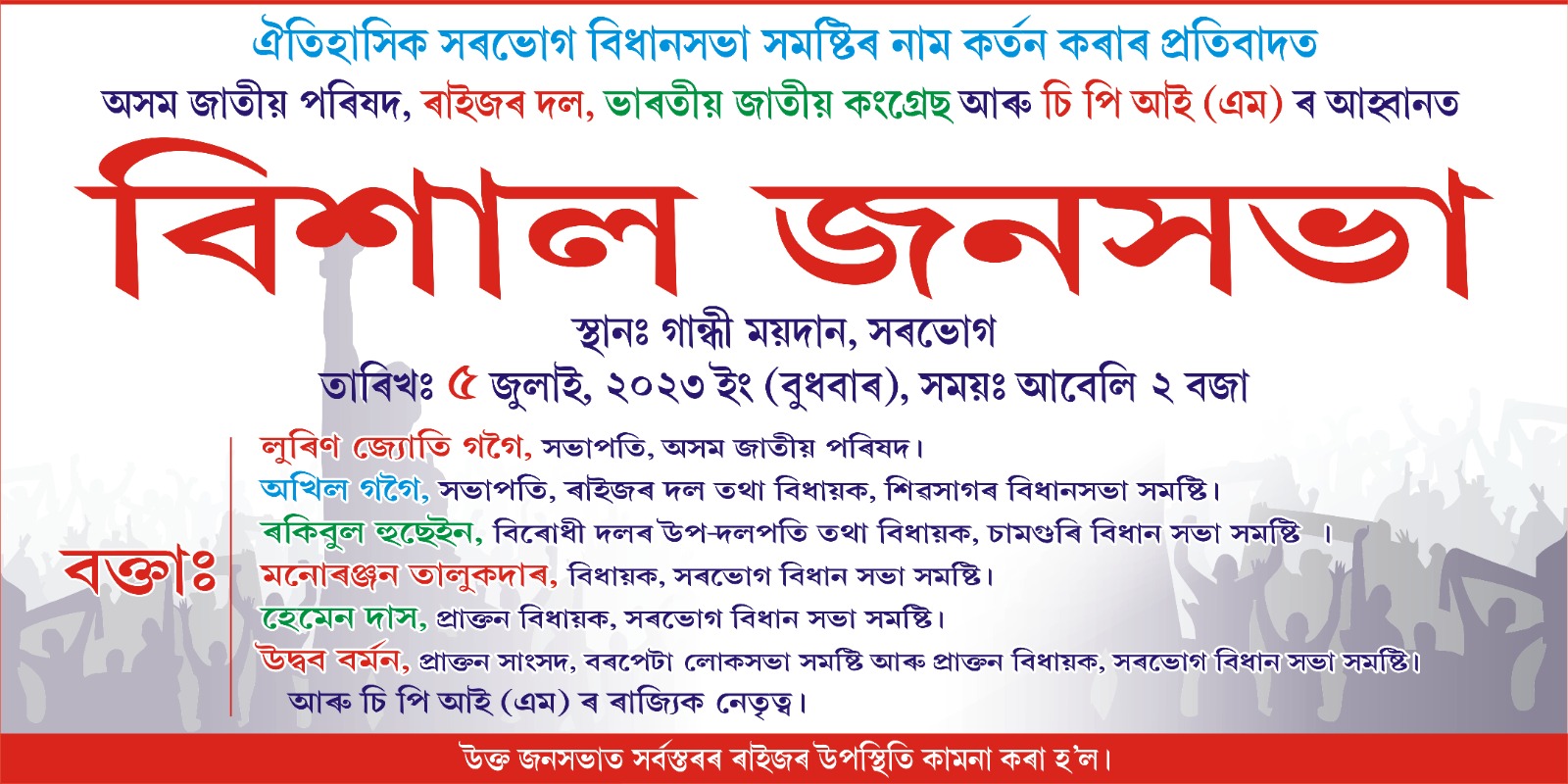 বিশাল প্ৰতিবাদী জনসভাত উপস্থিত থাকিব অসম জাতীয় পৰিষদৰ সভাপতি লুৰিণ জ্যোতি গগৈ , ৰাইজৰ দলৰ সভাপতি তথা শিৱসাগৰ বিধানসভা সমষ্টিৰ বিধায়ক অখিল গগৈ , বিৰোধী দলৰ উপ সভাপতি তথা চামগুৰি বিধানসভা সমষ্টিৰ বিধায়ক ৰকিবুল হুছেইন , সৰভোগ সমষ্টিৰ বিধায়ক মনোৰঞ্জন তালুকদাৰ , সৰভোগ সমষ্টিৰ প্ৰাক্তন বিধায়ক হেমেন দাস আৰু প্ৰাক্তন বৰপেটা লোকসভা সাংসদ, প্ৰাক্তন বিধায়ক উদ্বব বৰ্মন। বুধবাৰে বিশাল প্ৰতিবাদী জনসভাত ৰাইজক উপস্থিত থাকিবলৈ সৰভোগ সমষ্টিৰ বিধায়ক মনোৰঞ্জন তালুকদাৰে আহ্বান জনায়।