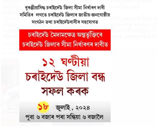 দীৰ্ঘদিন ধৰি চৰাইদেউ জিলাখনৰ বহুকেইটা জাতীয় জনগোষ্ঠীয় দল সংগঠনৰ নেতৃত্বৰ লগতে জিলাখনৰ বুদ্ধিজীৱী আৰু বহু সমাজ সেৱী ৰাইজৰ দ্বাৰা গঠন হোৱা চৰাইেউ জিলা সীমা সুৰক্ষা দাবী সমিতিয়ে অহা ১৮/০৭/২০২৪ তাৰিখে চৰাইদেউ মৈদাম ক্ষেত্ৰ চৰাইদেউ জিলাত অন্তৰ্ভুক্তিৰ বাবে ১২ ঘণ্টিয়া চৰাইদেউ জিলা বন্ধ ঘোষণা কৰিছিল।