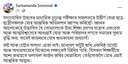 ঘোষণা হ’ল উচ্চতৰ মাধ্যমিকৰ চূড়ান্ত পৰীক্ষাৰ ফলাফল। পৰীক্ষাত উত্তীৰ্ণ প্ৰতিগৰাকী শিক্ষাৰ্থীলৈ শুভেচ্ছা জ্ঞাপন কেন্দ্ৰীয় মন্ত্ৰী সৰ্বানন্দ সোণোৱালৰ। আশানুৰূপ ফলাফল লাভ নকৰা সকলকো ন উদ্যমেৰে আগুৱাই যোৱাৰ আহ্বান কেন্দ্ৰীয়মন্ত্ৰীগৰাকীৰ।